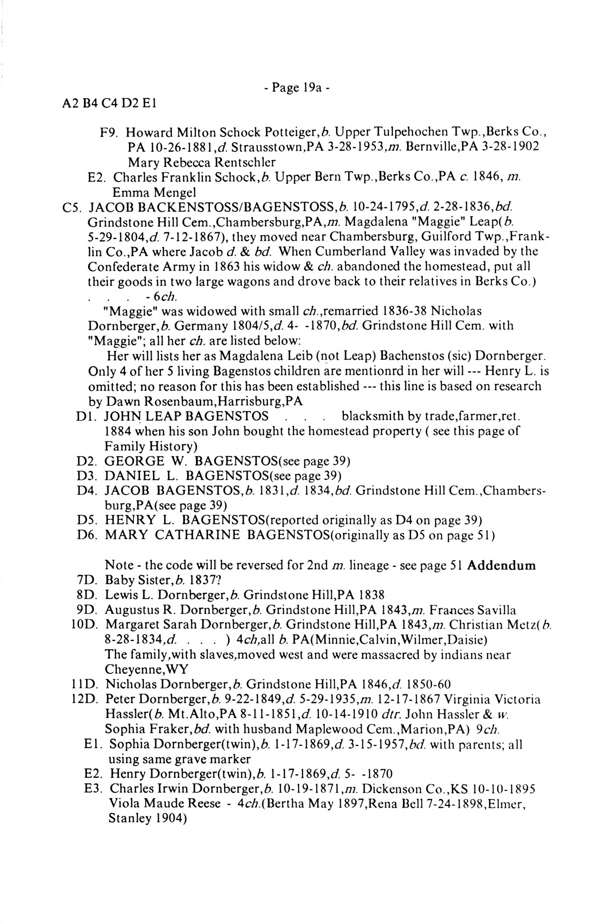 Grindstone Hill Cem. with "Maggie"; all her ch. arelisted below:Her will lists her as Magdalena Leib (not Leap) Bachenstos (sic) Dornberger. Only 4of her 5 living Bagenstos children are mentionrd in her will Henry L. is omitted; noreason for this has been established this line is based on research by DawnRosenbaum,Harrisburg,PA |