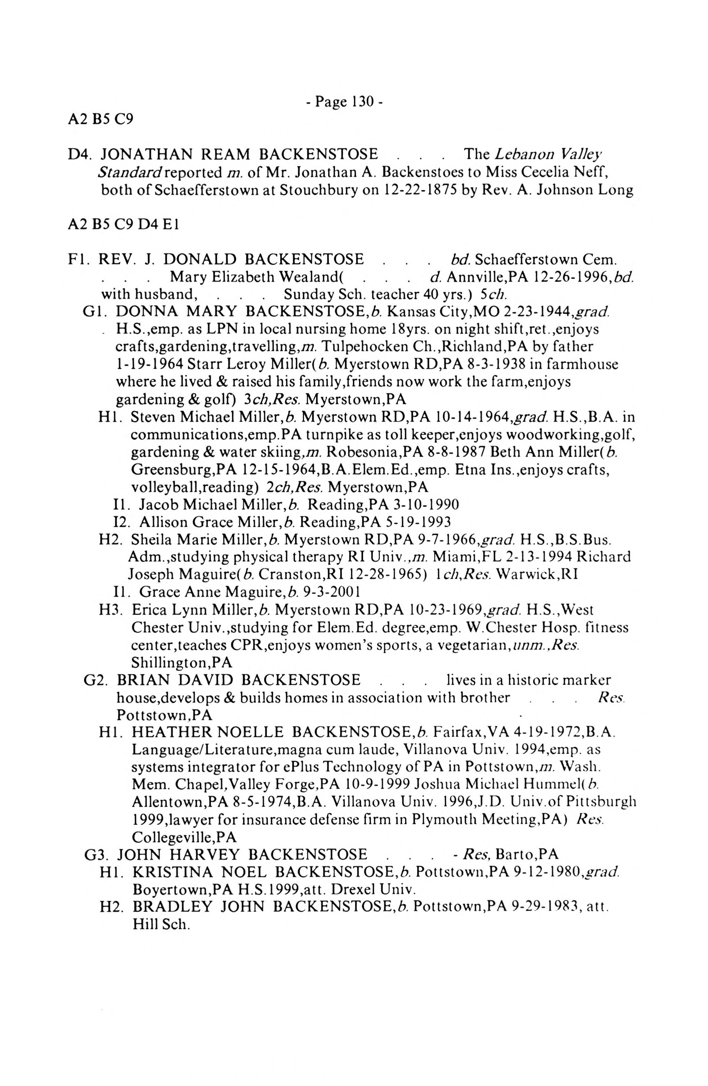 Addendum to Backenstoss--Baggenstoss Family History - 2002