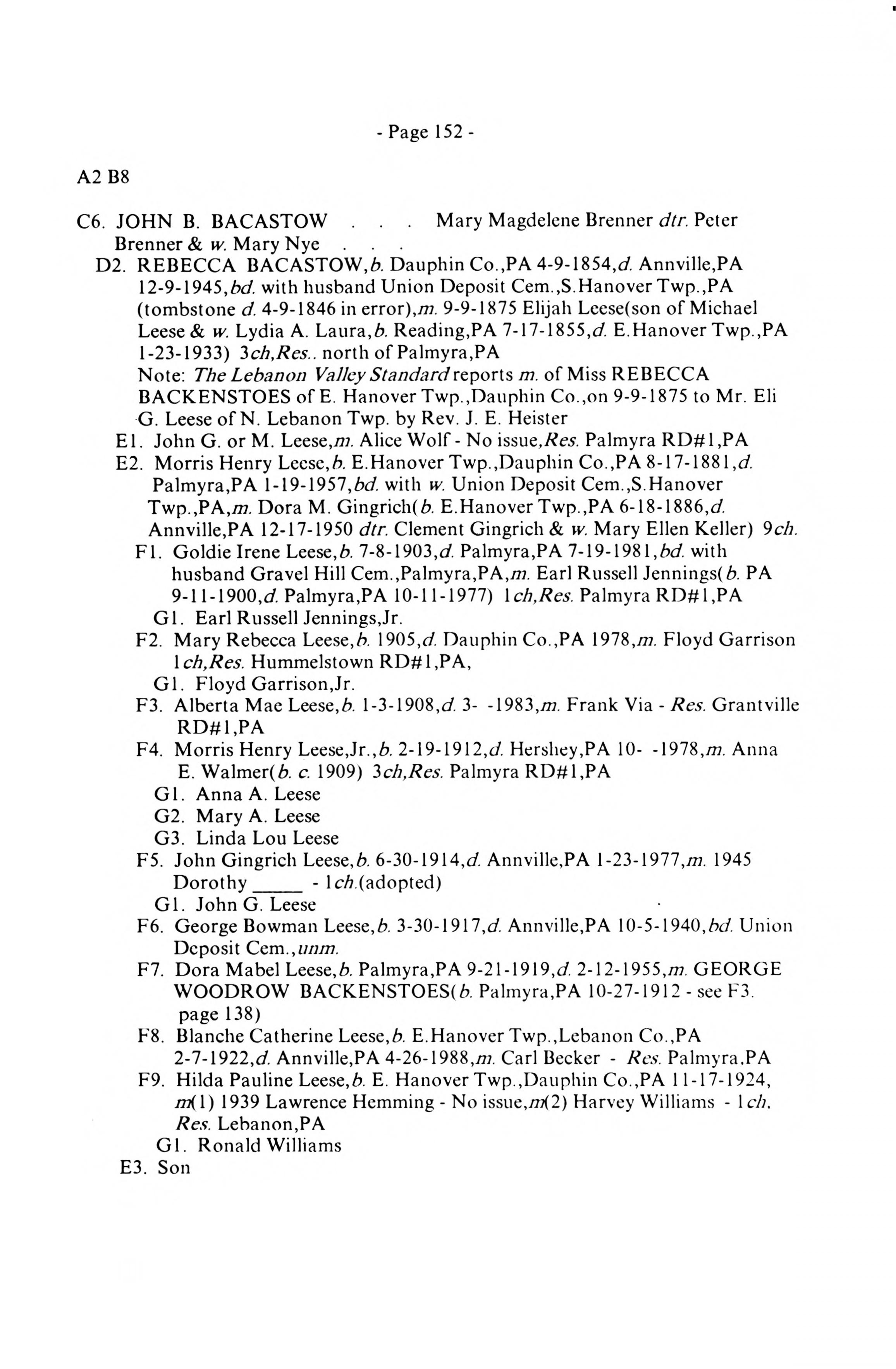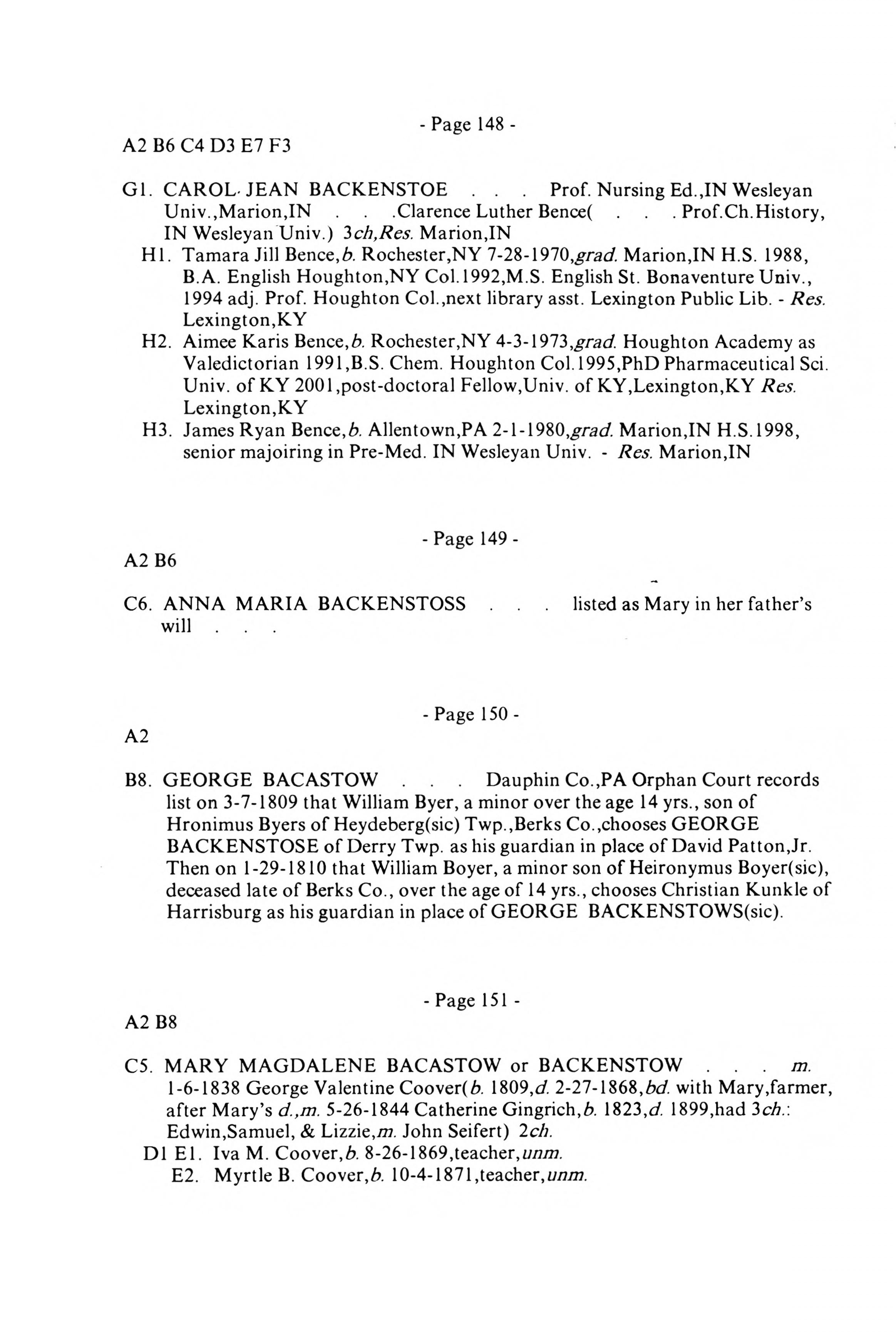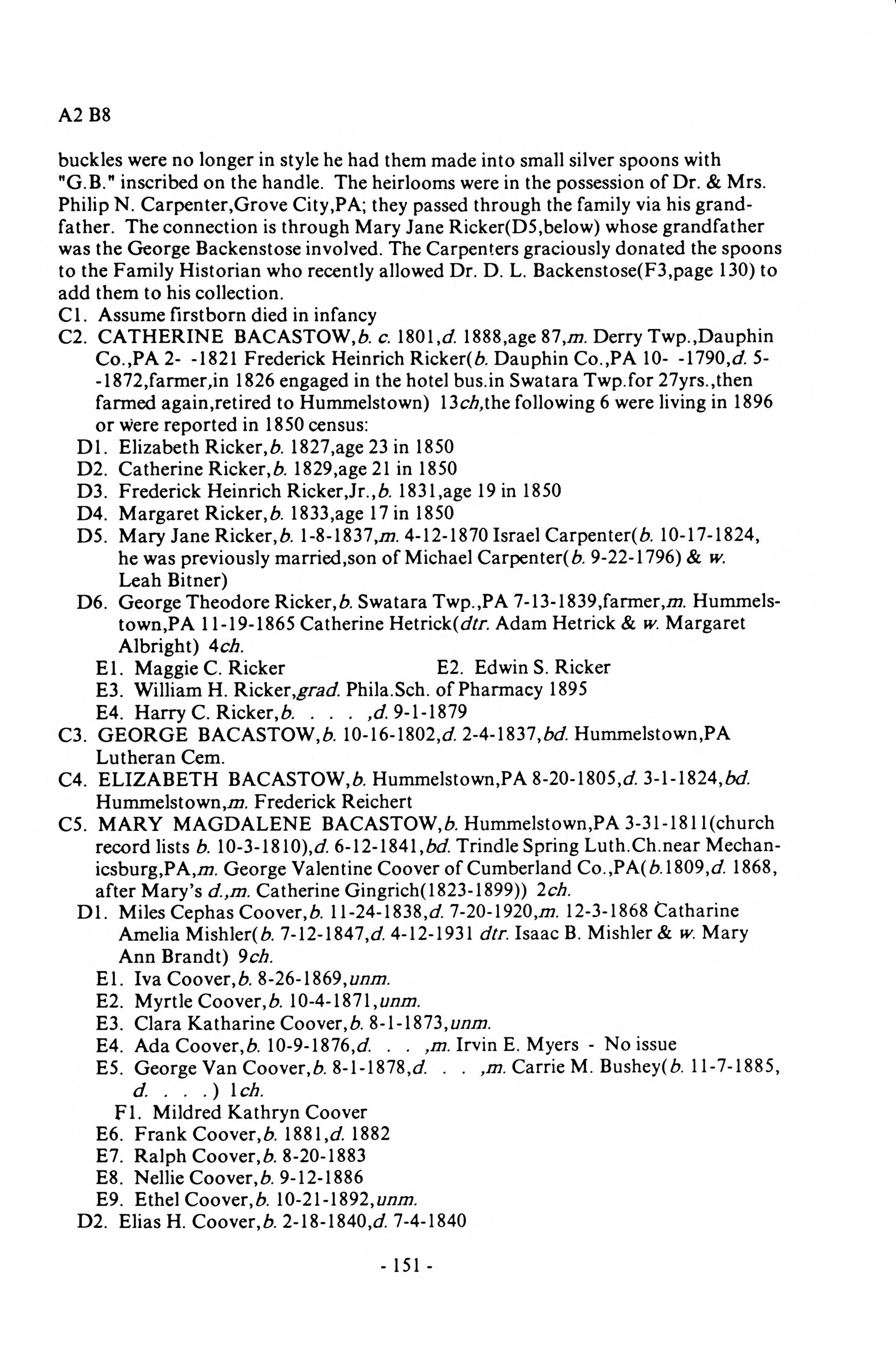 6 Children. for CATHERINE BACKSTOEs parents,George & Elizabeth(Hoover) Backstoe,natives of Lebanon Co. & farmers.The 1810 census lists household of GEORGE BACKENSTOSE of Hummels- town.PA as:1M{10,1M 10-16,1M 16-26,1M 26-452F {10, IF 26-45, IF }45 He & w. fit age 26-45; all their ch. are under 10The two males unaccounted for could be relatives or workers; the female over 45 could be hiswifes mother.He could not be located in Dauphin Co. in 1820 census,but the 1830 census has him living iDerry Twp.,Dauphin Co. with following in household:1M 10-15,1M 20-30,1M 50-60 IF 5-10, IF 15-20, IF 50-60 In 1840 census he is listed inDauphin Co. as::1M 20-30,1M 60-70; IF 50-60 In 1850 census his w.,ELIZABETHBACASTOW,age 80,is living in Upper Swatara Twp. .Dauphin Co. in household of her son-in-law,(Frederick) Heinrich Rickert(instead of Ricker).Early settler GEORGE BACKENSTOSE had shoes with silver buckles. When-150-A2 B8buckles were no longer in style he had them made into small silver spoons with "G.B."inscribed on the handle. The heirlooms were in the possession of Dr. & Mrs. Philip N.Carpenter,Grove City,PA; they passed through the family via his grandfather. The connectionis through Mary Jane Ricker(D5,below) whose grandfather was the George Backenstoseinvolved. The Carpenters graciously donated the spoons to the Family Historian who recentlyallowed Dr. D. L. Backenstose(F3,page 130) to add them to his collection |